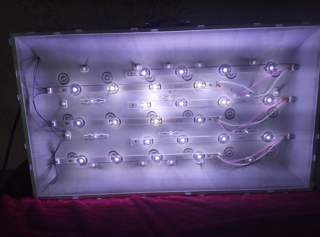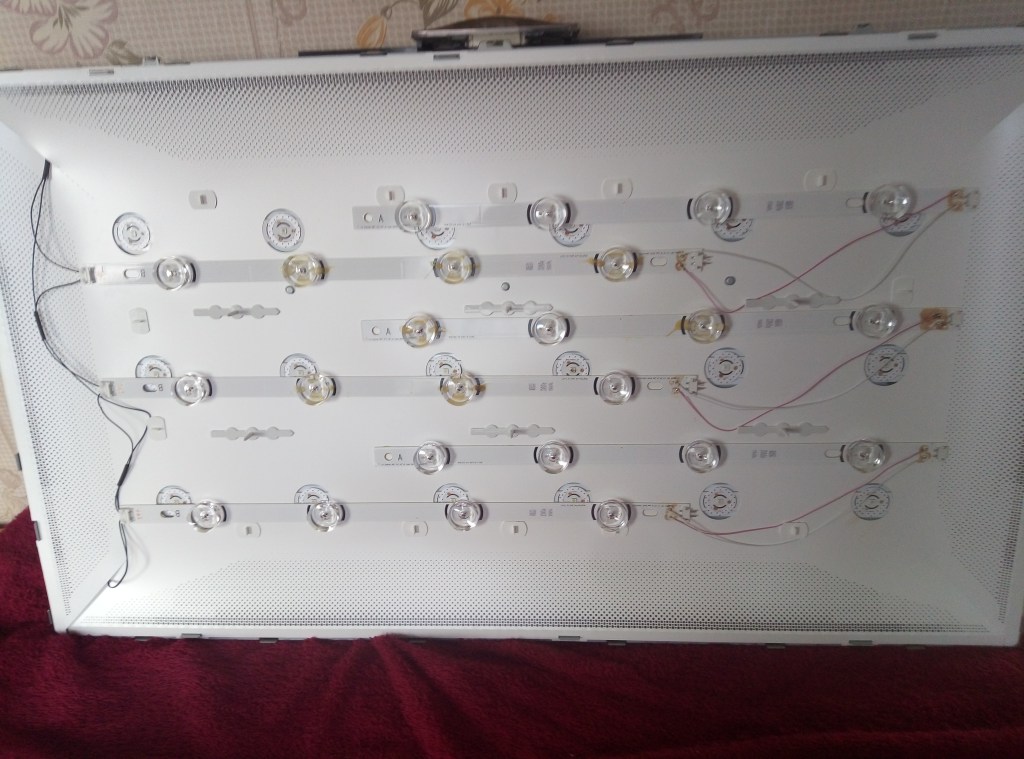 На прошлой неделе полетела подсветка на TV панели. Лампой посмотрел, изображение есть. Полетели LED элементы. На этой недели было меньше дел решил сунуть жало в потроха. Странно, телику всего четыре года. В общем был «донор», правдв на 42 дюйма. Этот на 32. Чтобы снять линейки с светодиодами, пришлось патрашить весь телевизор. При замене не стал снимать старые линейки, дабы не колбасить последний тоже.